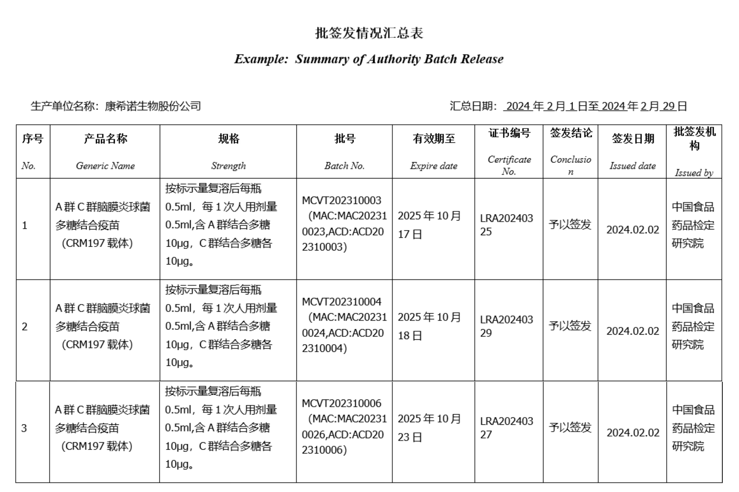 2024年2月份产品批签发信息