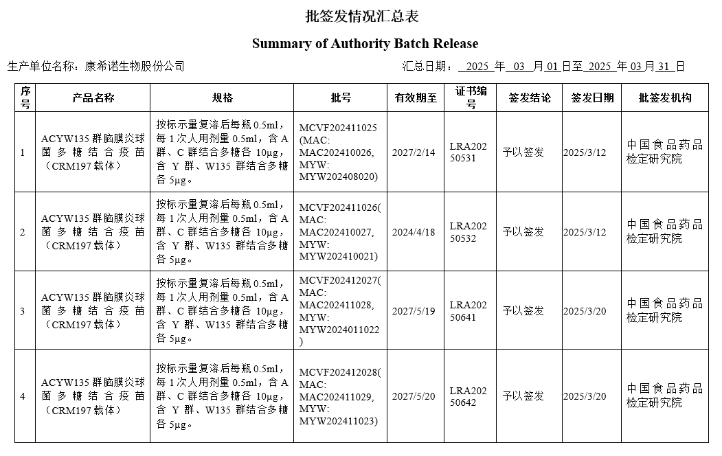 2025年3月份产品批签发信息